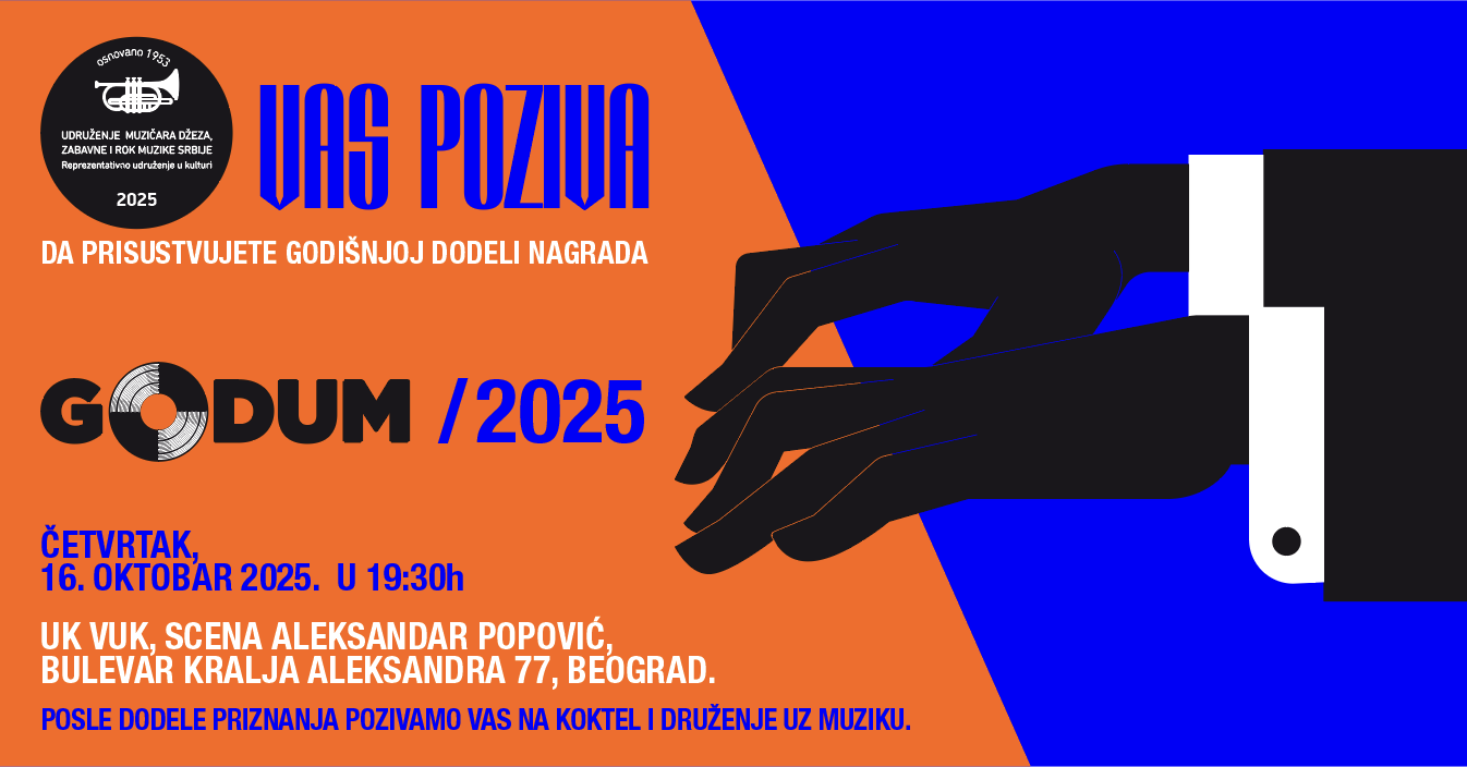 Udruženje vas poziva da prisustvujete godišnjoj dodeli nagrada GODUM 2025 u četvrtak, 16. oktobra 2025. u 19:30h na UK Vuk, Scena Aleksandar Popović, Bulevar Kralja Aleksandra 77, Beograd, a nakon dodele priznanja pozivamo vas na koktel i druženje uz muziku.